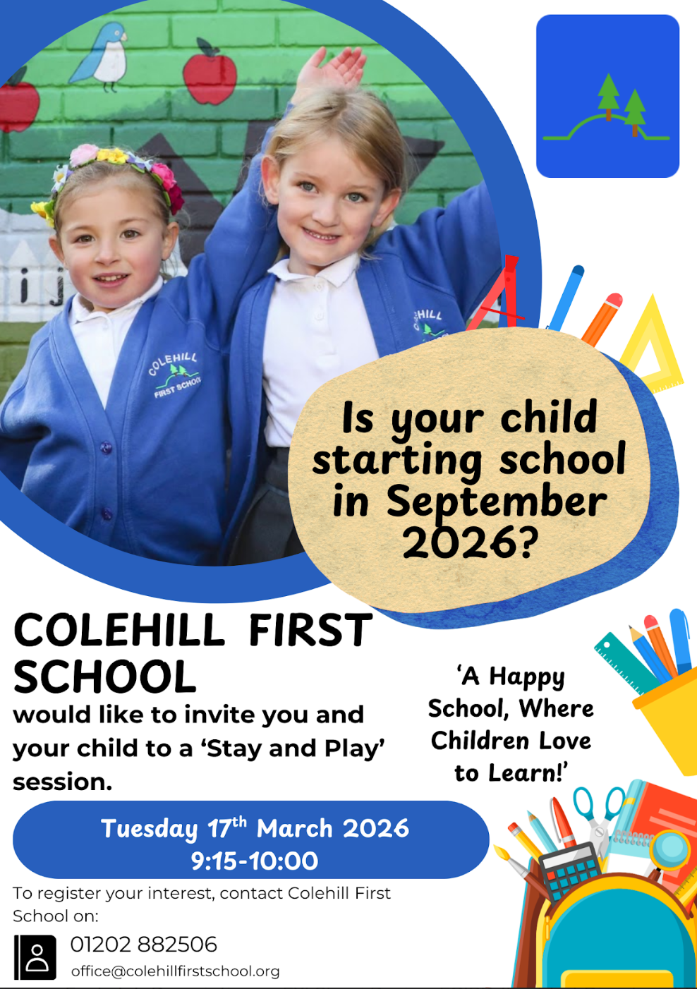 For new pupils due to start school in September, tours are available during the Autumn Term. Please telephone the school on 01202 882506 to book a place, or email office@colehillfirstschool.org.