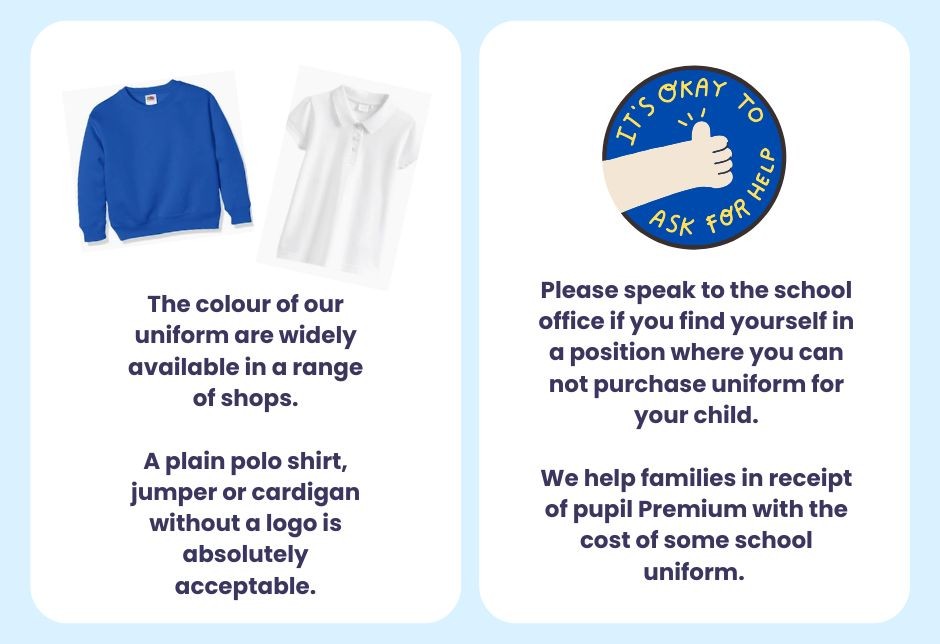 - Royal blue school cardigan, jumper or sweatshirt (plain or with the school logo)